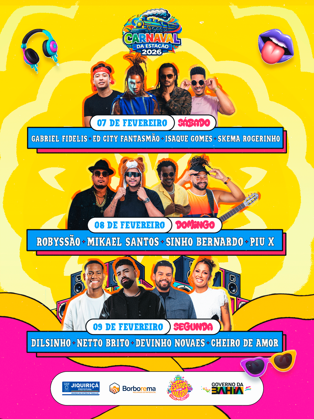 O evento acontece nos dias 07, 08 e 09 de fevereiro de 2026, na Praça da Estação, reunindo uma mistura vibrante de ritmos, apresentações culturais e blocos que mantêm viva a identidade do carnaval jiquiriçaense. A expectativa é de que moradores e visitantes lotem o espaço para aproveitar a energia contagiante que marca o período carnavalesco no município.
