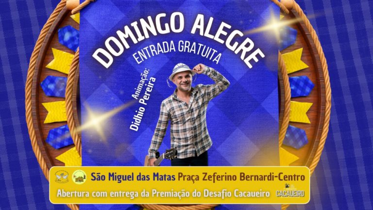 Foto: Divulgação Acontece na Praça Paroquial, Pe. Zeferino Bernardi no centro de São Miguel das Matas neste 18 de maio, o “Domingo Alegre”, uma ação aberta ao público com animação de Didhio Pereira, à partir das 09:30. Além da som ao vivo, comidas, bebidas e diversão para as crianças, promove também a integração social e o … continue