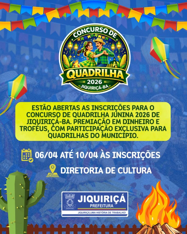 A Prefeitura de Jiquiriçá anunciou a abertura das inscrições para o Concurso de Quadrilhas Juninas 2026, iniciativa que promete valorizar ainda mais as tradições culturais do município e incentivar a participação das comunidades locais nos festejos juninos. De acordo com o cronograma divulgado, as inscrições estarão abertas no período de 06 a 10 de abril … continue