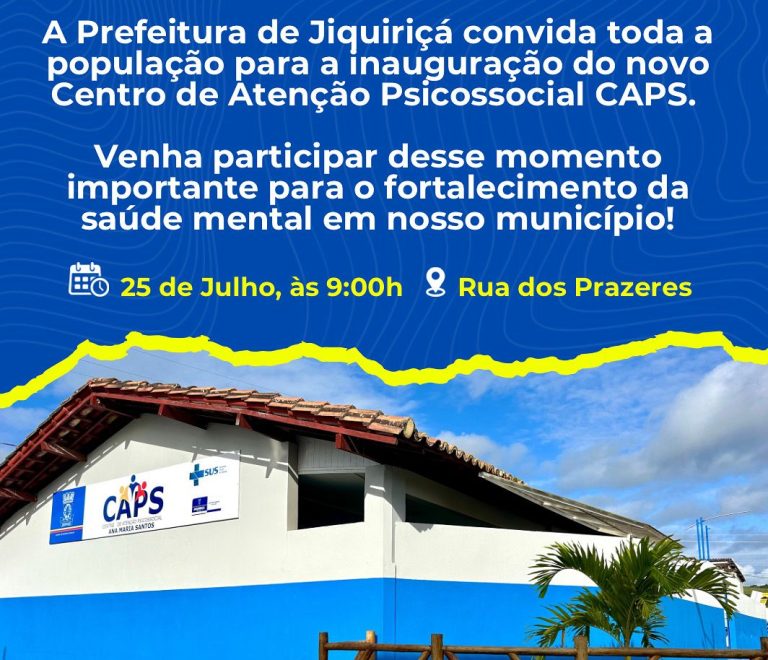 Foto: Divulgação A Prefeitura de Jiquiriçá convida toda a população para um momento histórico: a inauguração do CAPS — Centro de Atenção Psicossocial — que acontecerá nesta sexta-feira, dia 25 de julho, às 9h, no bairro Prazeres. O novo equipamento de saúde marca um avanço significativo na rede municipal de atenção à saúde mental. O … continue