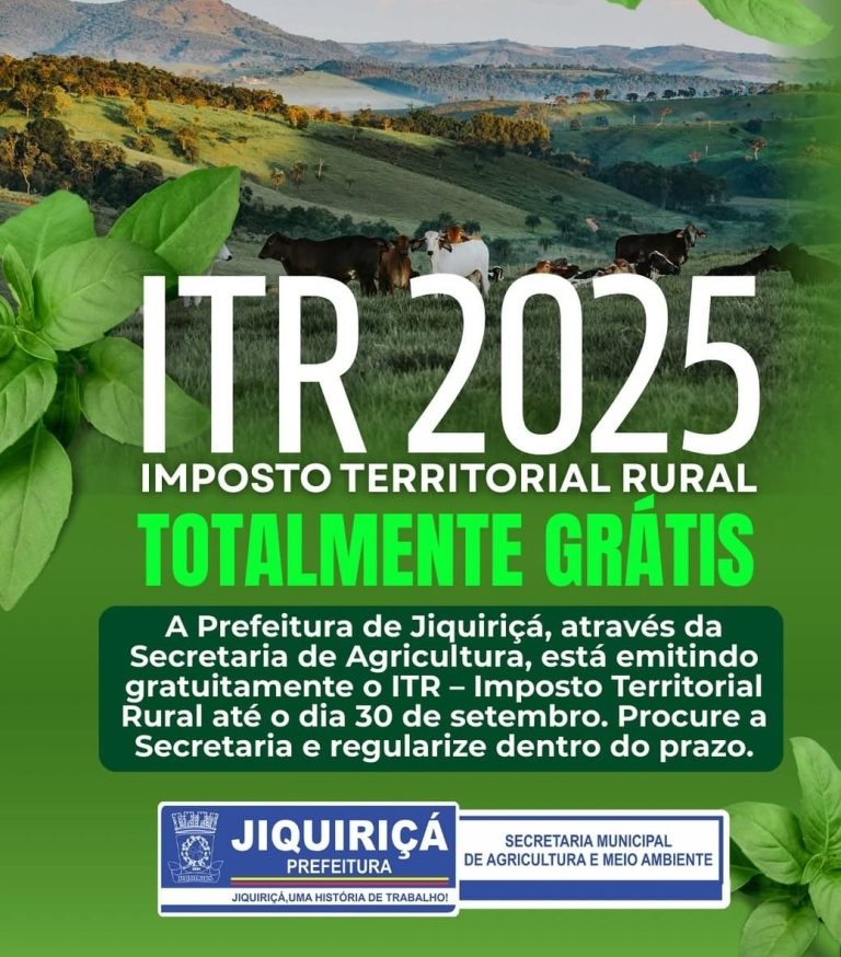 Foto: Divulgação A Prefeitura de Jiquiriçá, por meio da Secretaria Municipal de Agricultura, está realizando a emissão gratuita do Imposto Territorial Rural (ITR). O serviço, destinado a produtores rurais do município, segue disponível até o próximo dia 30 de setembro. A iniciativa busca facilitar o acesso dos agricultores à regularização de suas propriedades, evitando custos … continue