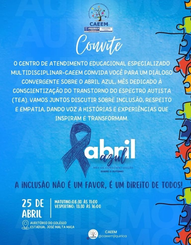 Foto: Reprodução O Centro de Atendimento Educacional Especializado Multidisciplinar (CAEEM) de Jiquiriçá convida a comunidade para participar do evento especial em alusão ao Abril Azul, que será realizado no dia 25 de abril de 2025, no Auditório do Colégio Estadual José Malta Maia, em Jiquiriçá/BA. A programação será dividida em dois turnos — matutino (08h30 … continue