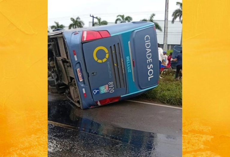 Foto: Reprodução Um ônibus da empresa Cidade Sol tombou no início da tarde desta quinta-feira (4), no KM 527 da BR-324, em Feira de Santana. Segundo informações da Polícia Rodoviária Federal (PRF), não houve mortes, mas ao menos dois passageiros ficaram feridos. O acidente aconteceu por volta das 12h50, enquanto o veículo transportava passageiros de … continue