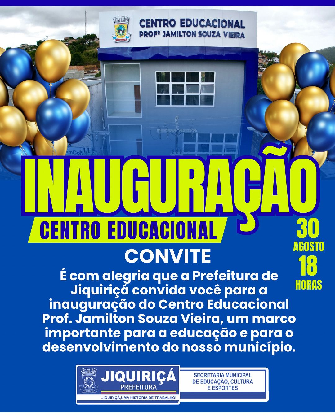 A Prefeitura Municipal de Jiquiriçá anuncia a inauguração do Centro Educacional Prof. Jamilton Souza Vieira, um importante marco para o fortalecimento da educação no município. A solenidade está marcada para esta Sabado, 30 de agosto, às 18h, no próprio Centro Educacional, localizado no Centro da cidade.