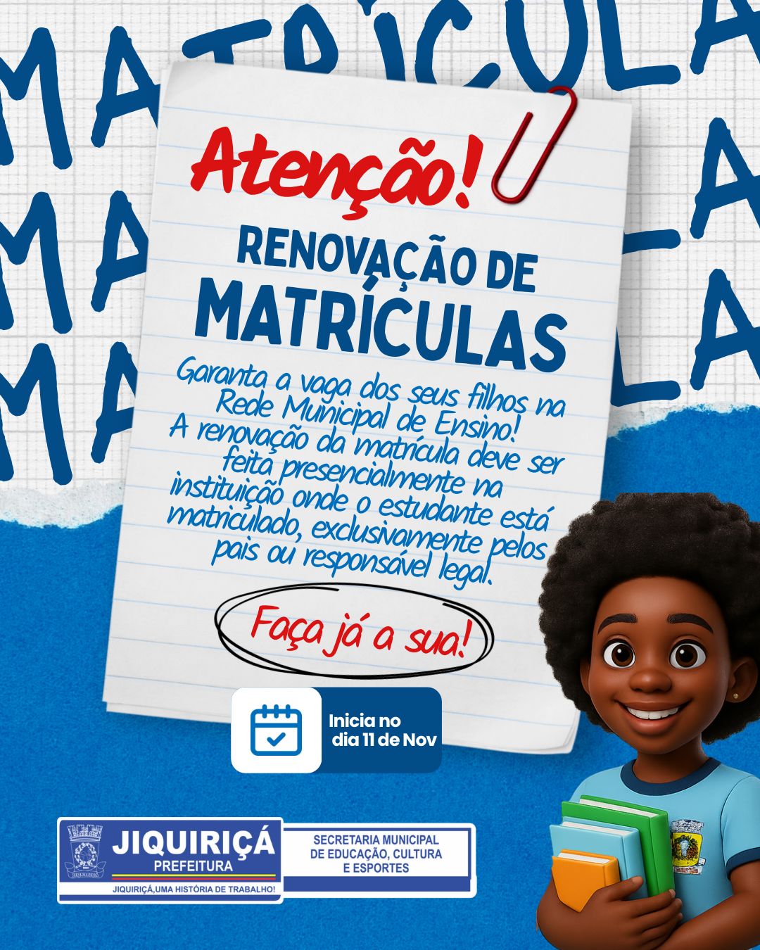 A Rede Municipal de Ensino de Jiquiriçá deu início ao processo de renovação de matrículas para o ano letivo de 2026. O procedimento é destinado aos estudantes que já estão regularmente matriculados nas unidades escolares do município e tem como objetivo garantir a continuidade do vínculo escolar, além de contribuir para o planejamento pedagógico e organizacional do próximo ano.