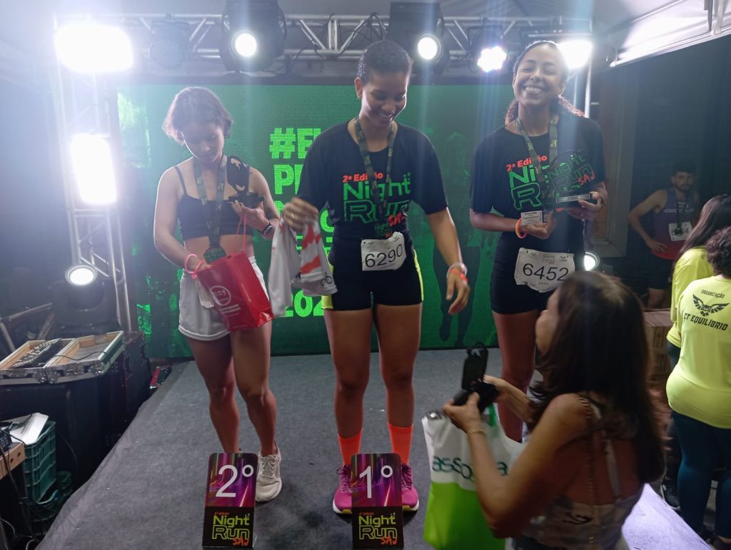 Ela ficou em 1º lugar na categoria de 18 a 29 anos, e a próxima corrida será dia 03 de maio na cidade de Santa Inês, no Vale do Jiquiriçá, interior da Bahia.Larissa Bastos sendo premiada pela participação na corrida Night Run
