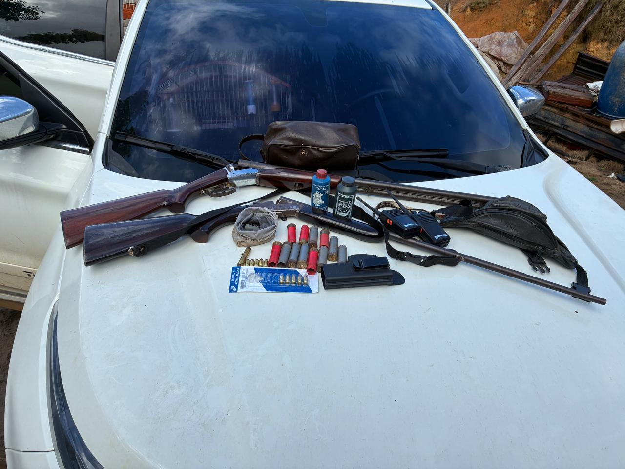 Durante a diligência, foram apreendidas uma espingarda calibre 12, uma espingarda calibre 36, munições de diversos calibres (12, 36 e .380), além de pólvora e chumbo. Também foram encontrados dois rádios comunicadores (HTs), possivelmente utilizados para comunicação entre envolvidos em atividades criminosas.