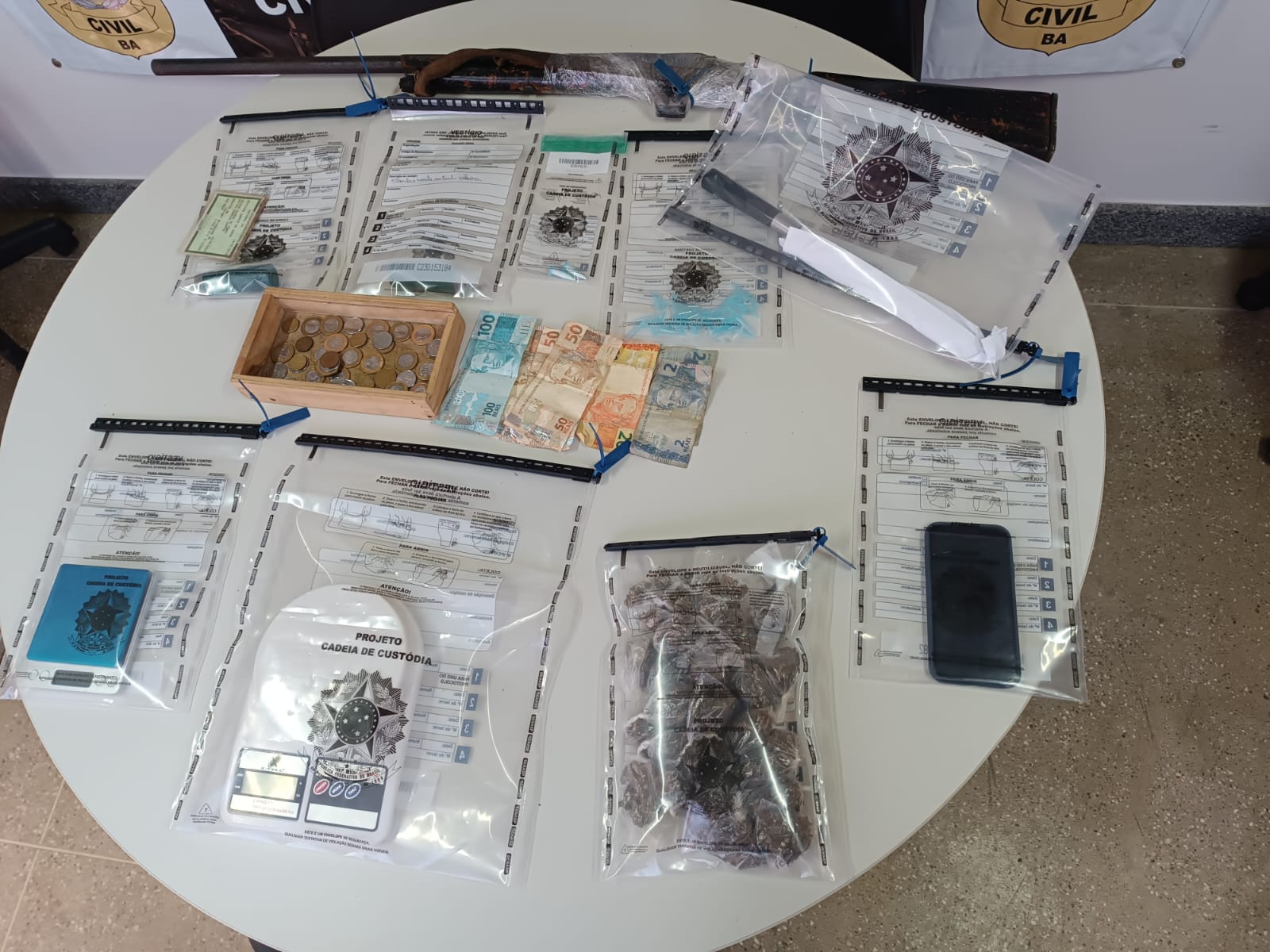 Na área de serviço do imóvel, foram encontrados diversos materiais ilícitos, incluindo porções de substâncias aparentando ser maconha e cocaína, uma espingarda, munições, balanças de precisão e embalagens utilizadas para acondicionamento de drogas. Também foram apreendidos uma faca tipo peixeira, um punhal, além de um aparelho celular e dinheiro em espécie.