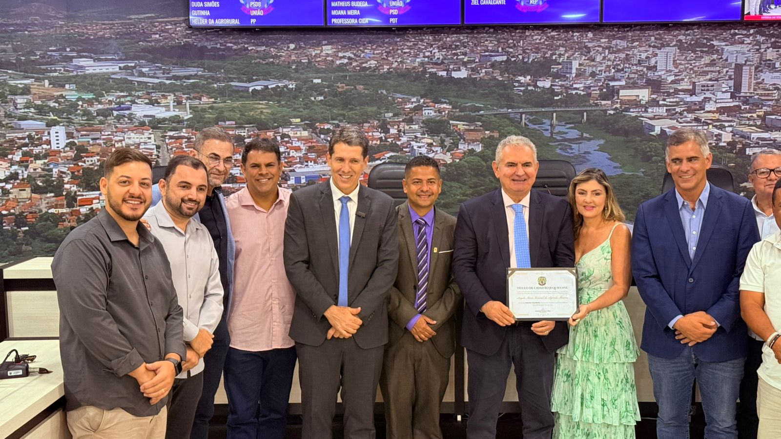 O prefeito de Ubaíra, Neném, participou, pela manhã, da solenidade de entrega do Título de Cidadão Jequieense ao senador Ângelo Coronel, realizada na Câmara de Vereadores de Jequié, a convite do prefeito Zé Cocá, ao lado do deputado Hassan.