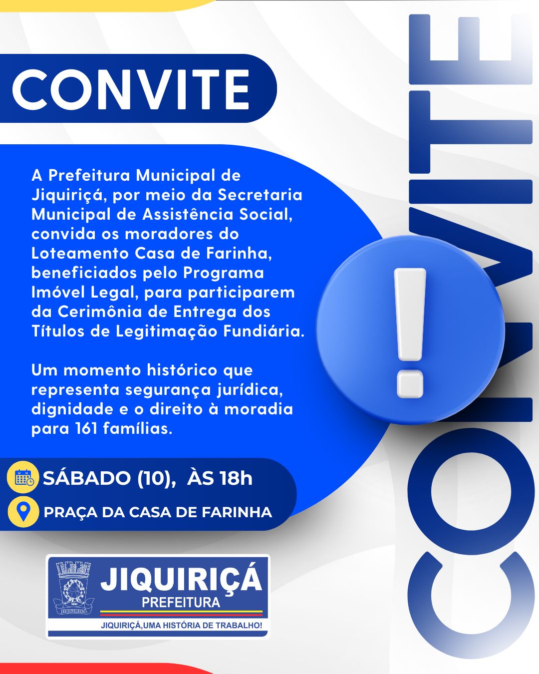 A Prefeitura convida todos os moradores beneficiados a participarem desse momento significativo, que simboliza cidadania, respeito e valorização das famílias jiquiriçaenses.