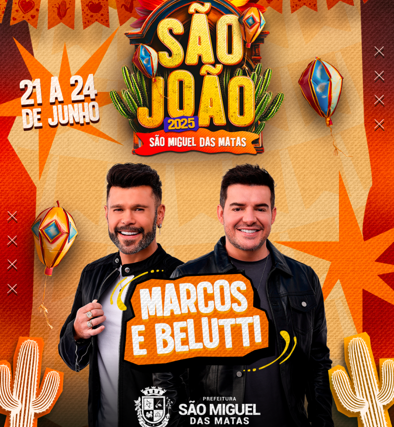 Além da apresentação de Marcos & Belutti, a Prefeitura Municipal promete divulgar mais atrações que irão compor a programação deste evento que valoriza a cultura e as tradições juninas.