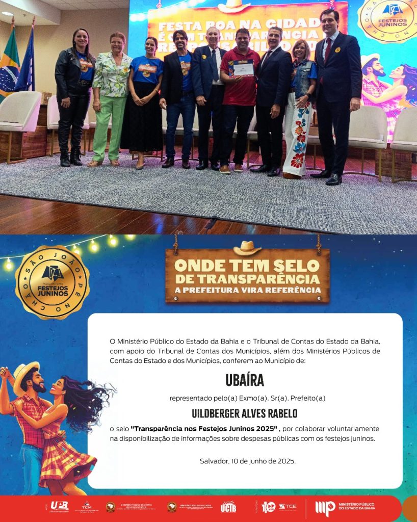 Na manhã desta segunda-feira (10), o município de Ubaíra foi reconhecido com o Selo de Transparência dos Festejos Juninos 2025, durante cerimônia oficial realizada em Salvador. A comitiva ubaírense foi representada pelo prefeito Neném e pelo secretário municipal de Cultura Laelson Leal.