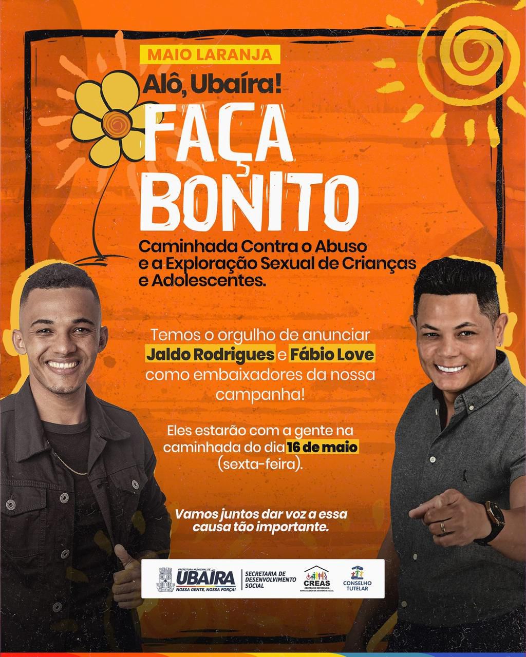 Na próxima sexta-feira, 16 de maio, Ubaíra se unirá em uma grande mobilização em defesa da infância e da adolescência. A Caminhada “Faça Bonito” será realizada pela Prefeitura de Ubaíra, como parte da campanha Maio Laranja, que chama atenção para o combate ao abuso e à exploração sexual de crianças e adolescentes.